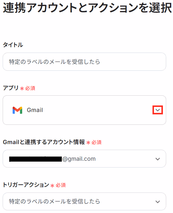 タイトルと連携するアカウント情報を任意で設定し、トリガーアクションはテンプレート通りに「特定のラベルのメールを受信したら」のまま「次へ」をクリックします。