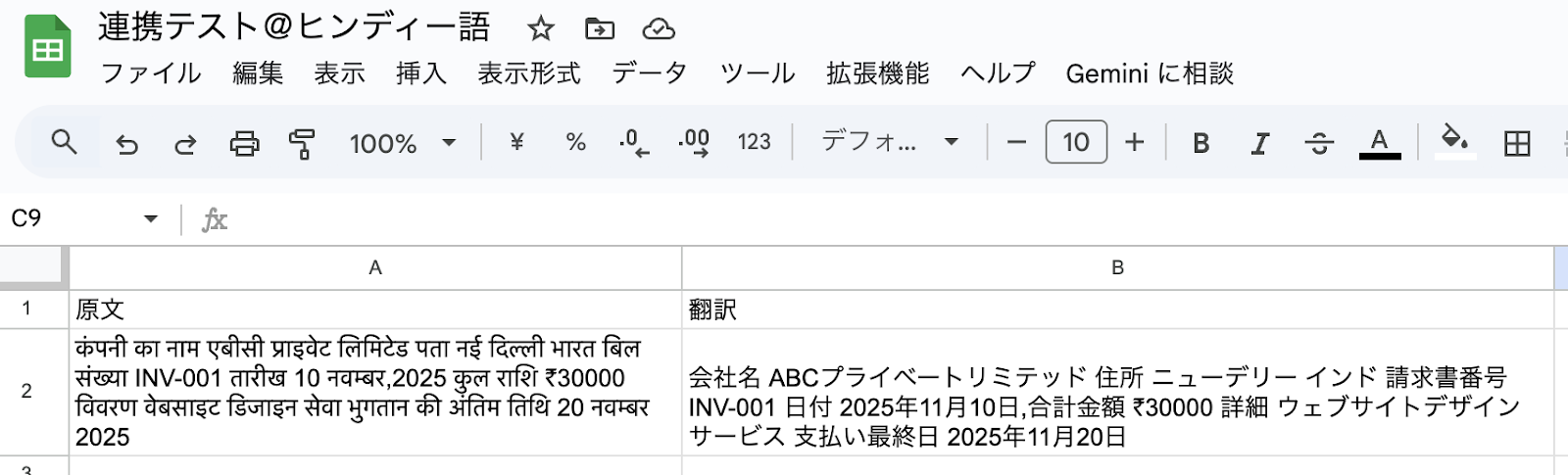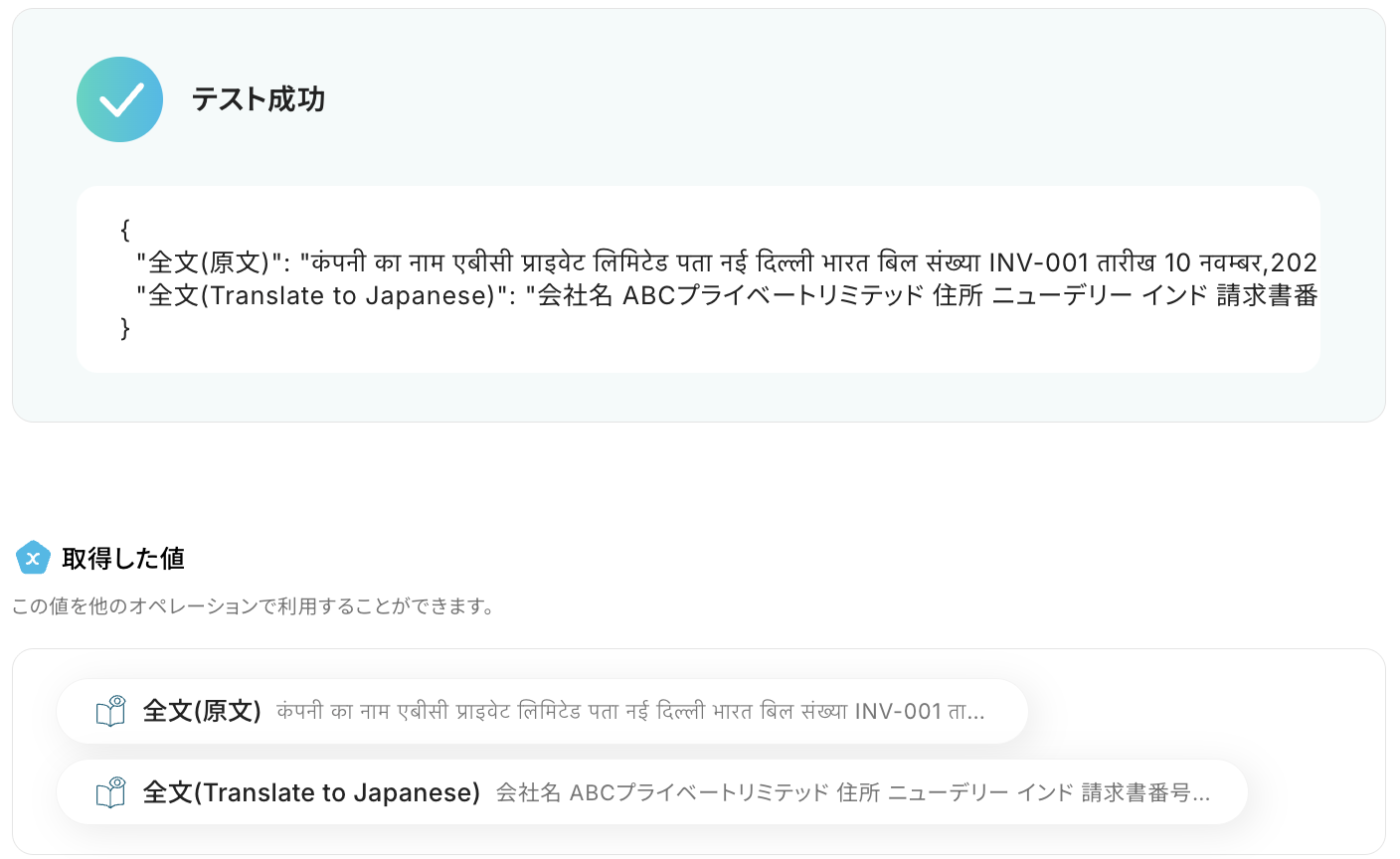 テストに成功すると、AIによって添付ファイルから読み取り・翻訳された情報が一覧で表示されます。
