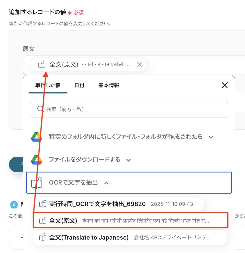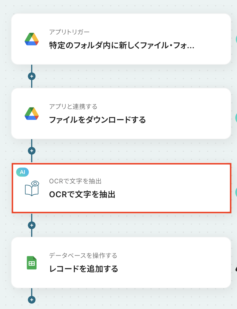 続いて、Google Driveからダウンロードしたファイルに対して、OCRで文字を読み取る設定を行いましょう。