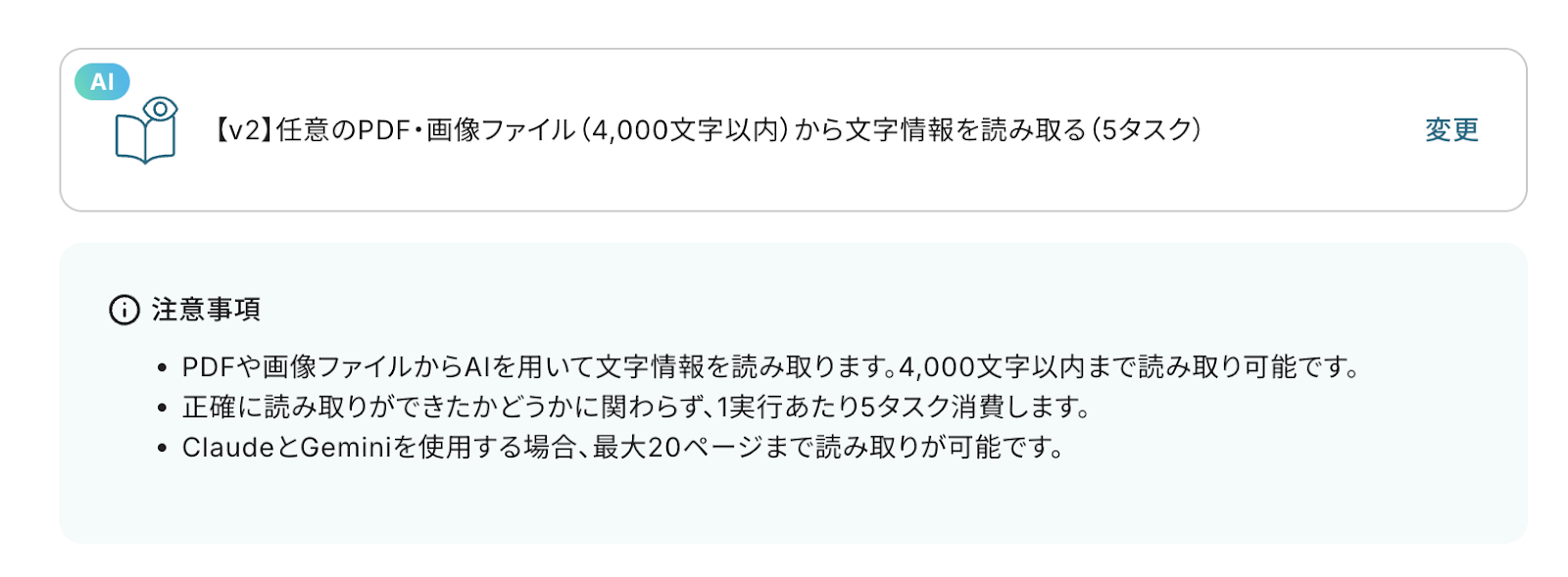 デフォルトで 「[v2] 任意のPDF・画像ファイル(4,000文字以内)から文字情報を読み取る(5タスク)」 が選択されていますので、内容を確認してください。