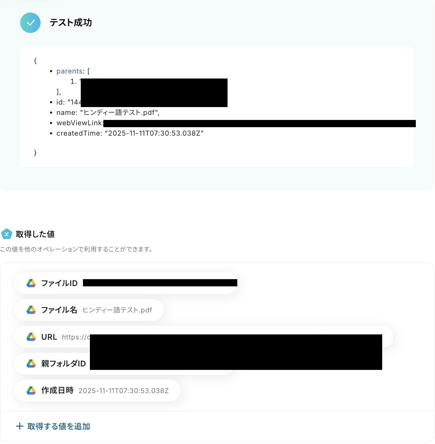 テストに成功すると、Google Driveにアップロードされたファイルに関する情報が一覧で表示されます。