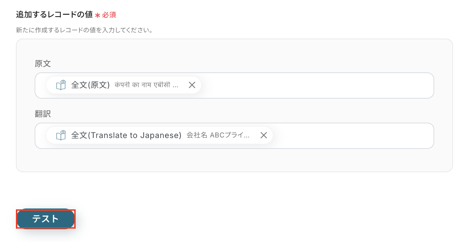 今回はダウンロードしたファイルからヒンディー語の原文とその翻訳結果(日本語)を抽出し、Google スプレッドシートにレコードとして追加したいため、以下の内容で設定しました。