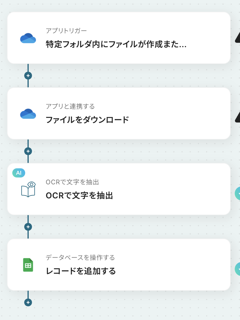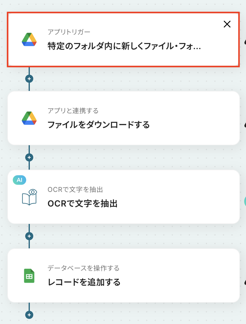 このワークフローを活用すれば、Google Driveの特定フォルダにPDFファイルが格納されるだけで、OCRが内容を自動で読み取りGoogle スプレッドシートに追記するため、こうした課題を解消し業務を効率化できます。