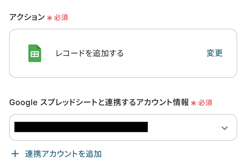 前のステップでOCR処理で抽出した値を利用して、Google スプレッドシートにレコードを追加しましょう。