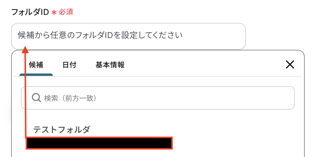 入力欄をクリックすると、前のステップでGoogle Driveから取得した値が表示されるので、選択して入力しましょう。