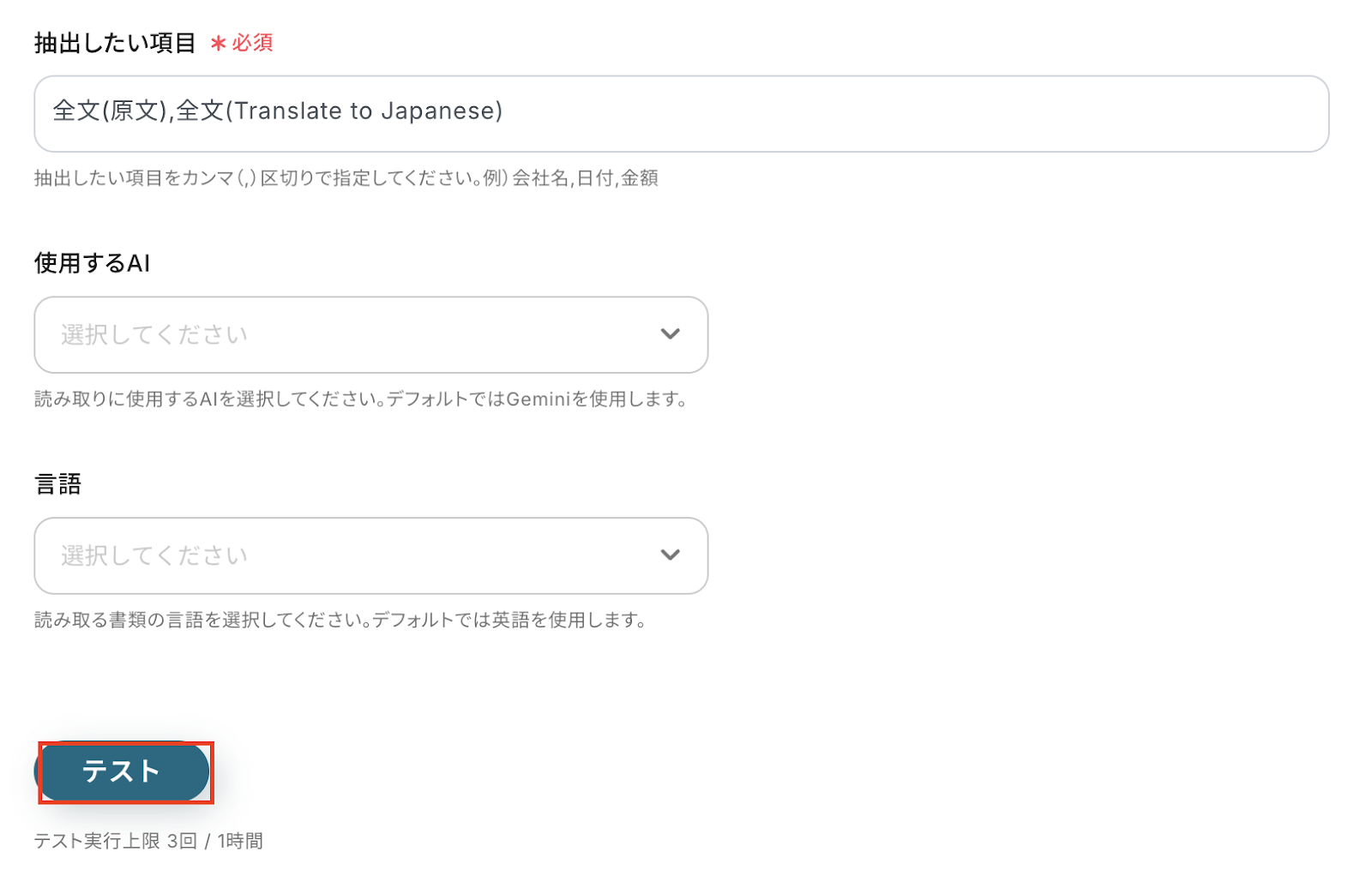 入力が完了したら、設定した項目が実際に正しく読み取りされるかどうかを確認するため「テスト」をクリックします。