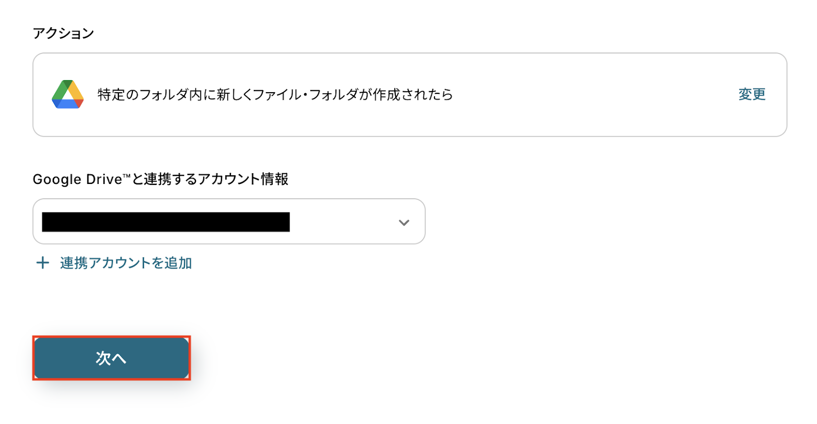 Google Driveと連携するアカウント情報に問題がなければ、「次へ」をクリックします。