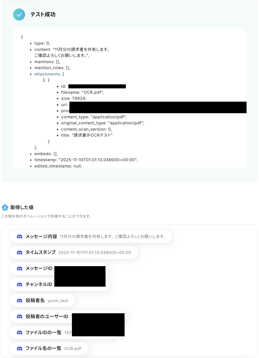 以下の取得した値は、この後のステップでメッセージ内のファイルをダウンロードする際に利用できます。