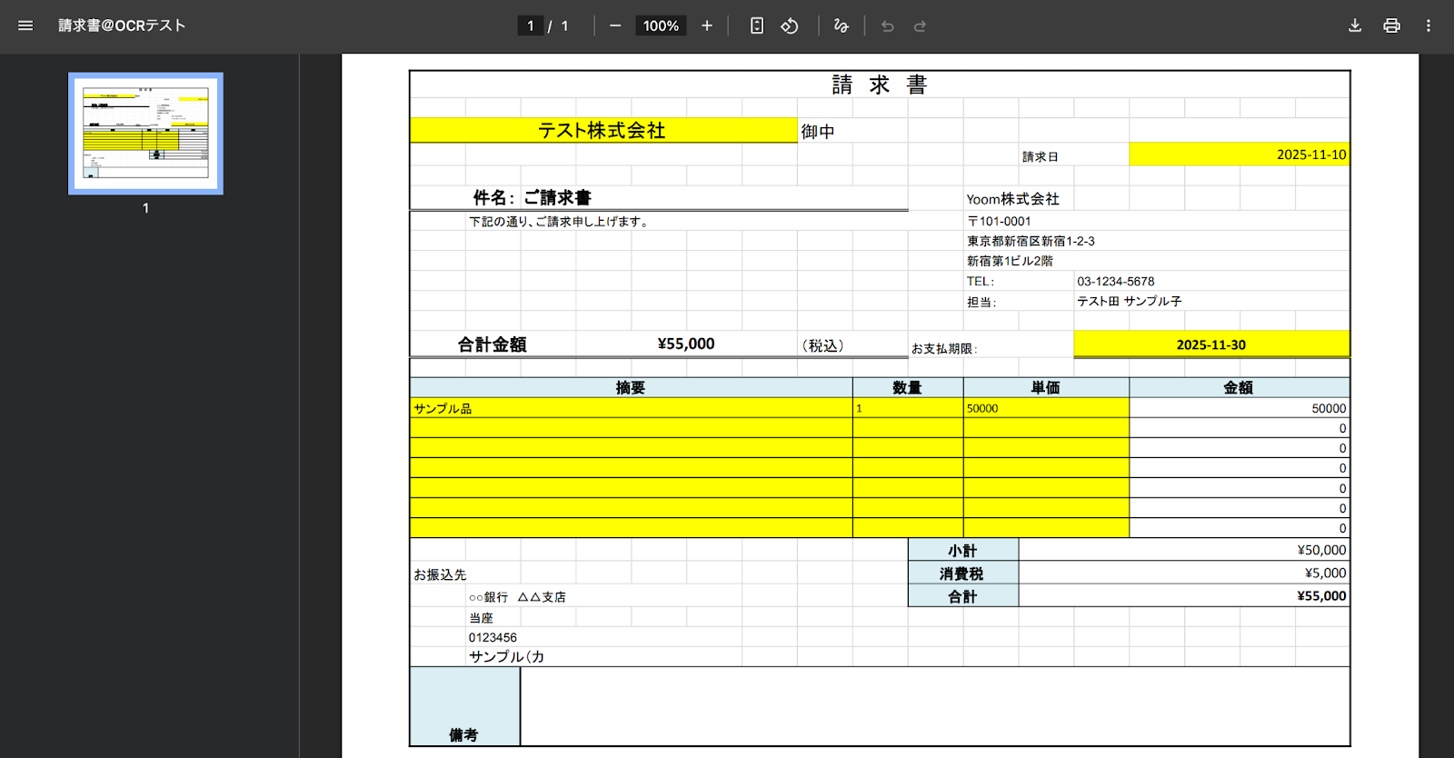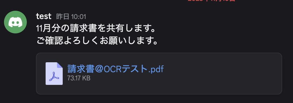 また、今回はメッセージ内のファイルをダウンロードしOCR処理を行うフローのため、以下の請求書ファイルをテスト用に添付しています。