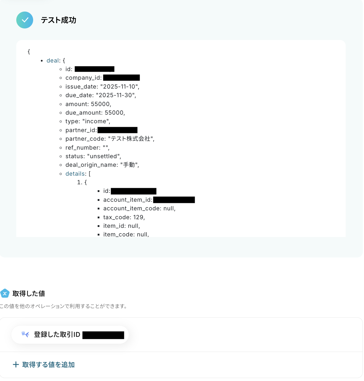 テストに成功すると、freee会計で検索された取引先に関する情報が一覧で表示されます。