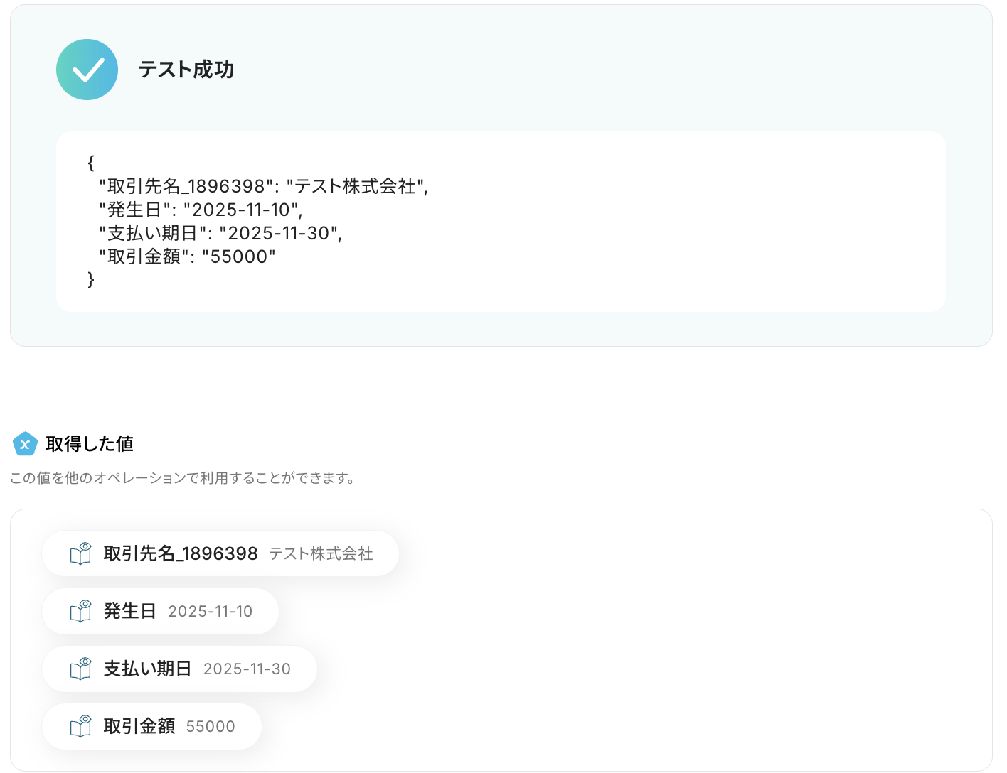 なお、テキストを直接入力した部分は固定値とされるため、取得した値を活用せず設定を行うと毎回同じデータがfreee会計に登録されてしまうので注意が必要です。
