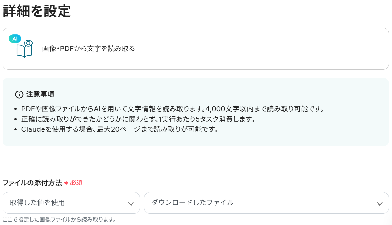 ※OCRや音声を文字起こしするAIオペレーションは、チームプラン・サクセスプラン限定の機能です。フリープランやミニプランでセットするとエラーになってしまうので、ご注意ください。チームプランやサクセスプランなどの有料プランは、2週間の無料トライアルが可能です。トライアル期間中は、通常だと制限があるアプリやAIオペレーションもすべて使えるので、気になる機能をぜひお試しください。
