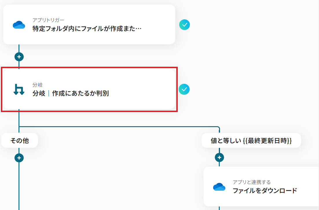 まず「分岐対象の取得した値」を設定します。オペレーションは「特定フォルダ内にファイルが作成または更新されたら」のままでOKです。