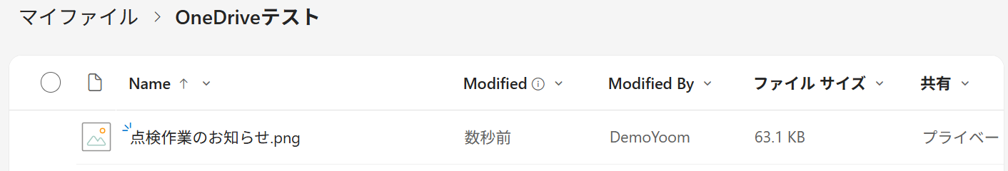 まず準備として、OneDriveのフォルダ内でファイルを作成または更新しておきましょう。今回は「点検作業のお知らせ」というファイルを追加しました。