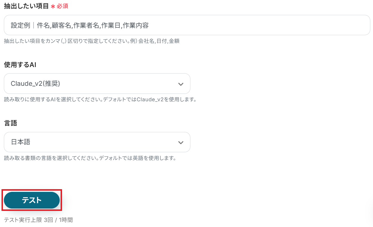 「抽出したい項目」も既に入力されていますが、編集・追加する場合はカンマ区切りで入力してください。 あとは任意で「使用するAI」と「言語」を入力してテストします。