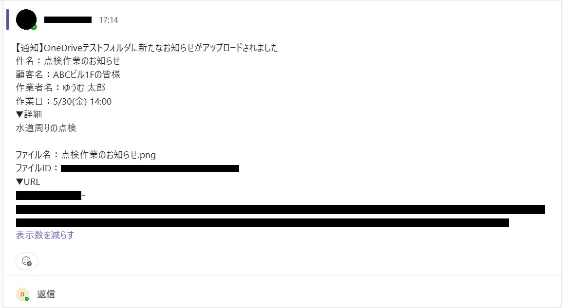 OneDriveへのファイル格納をトリガーに自動で通知が作成されるため、これまで手作業で行っていた共有連絡の時間を短縮することができます。 手動での通知作業が不要になるため、連絡のし忘れや宛先の間違いといったヒューマンエラーのリスク軽減に繋がります。 ■フローボットの流れ