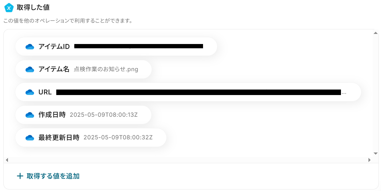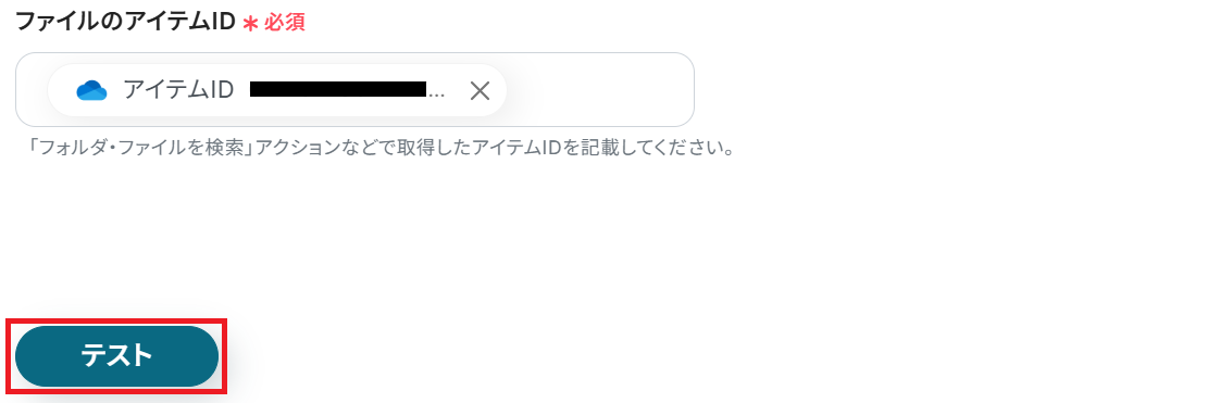 「ファイルのアイテムID」には予めアウトプットが入力されているので、そのままテストします。