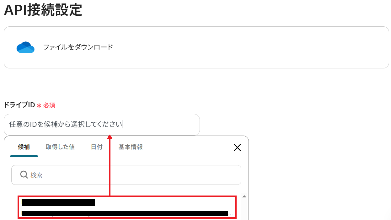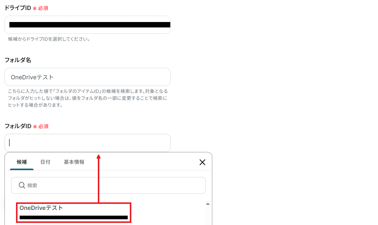 次に「ドライブID」と「フォルダID」を候補から選択してください。「フォルダ名」の欄に該当のフォルダ名を入力すると「フォルダID」の候補が絞られます。