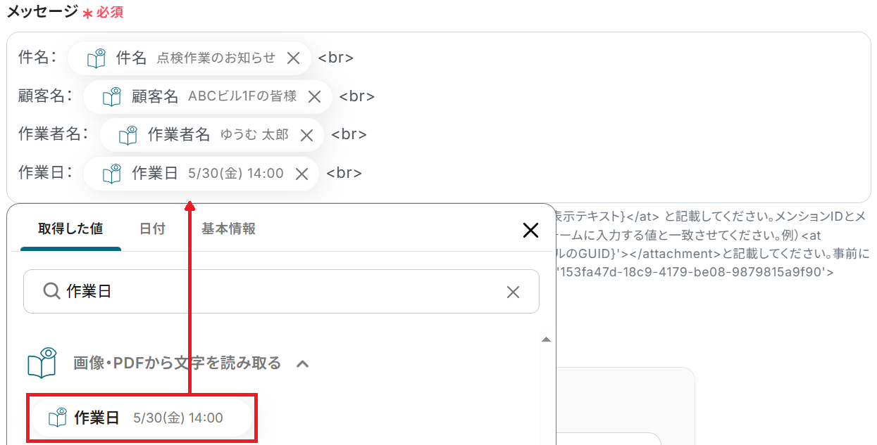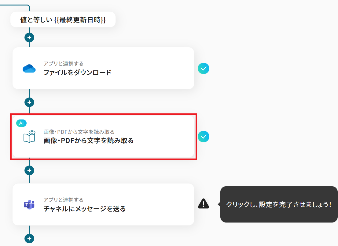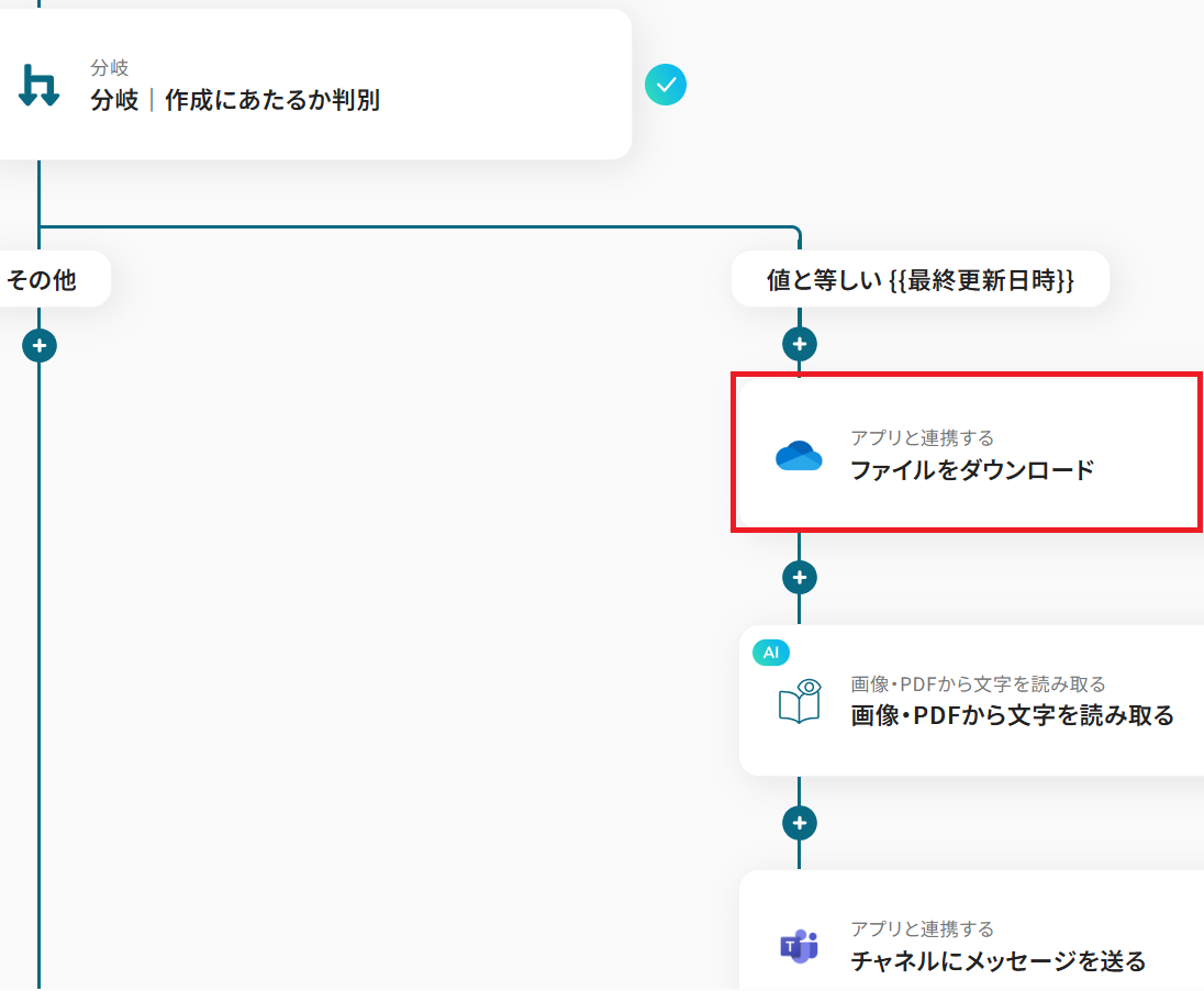 OneDriveの「ファイルをダウンロード」アクションでは、ファイルのアイテムIDにトリガーで取得した値を設定してください。 分岐機能では、ファイル名など任意の条件を設定することが可能です。 OCR機能の「任意の画像やPDFを読み取る」アクションでは、請求書番号や日付など、抽出したい項目を自由に設定できます。 Microsoft Teamsに送信するメッセージは、通知先のチャネルや本文の内容を任意で設定し、OCRで抽出した情報を含めることも可能です。 ■注意事項