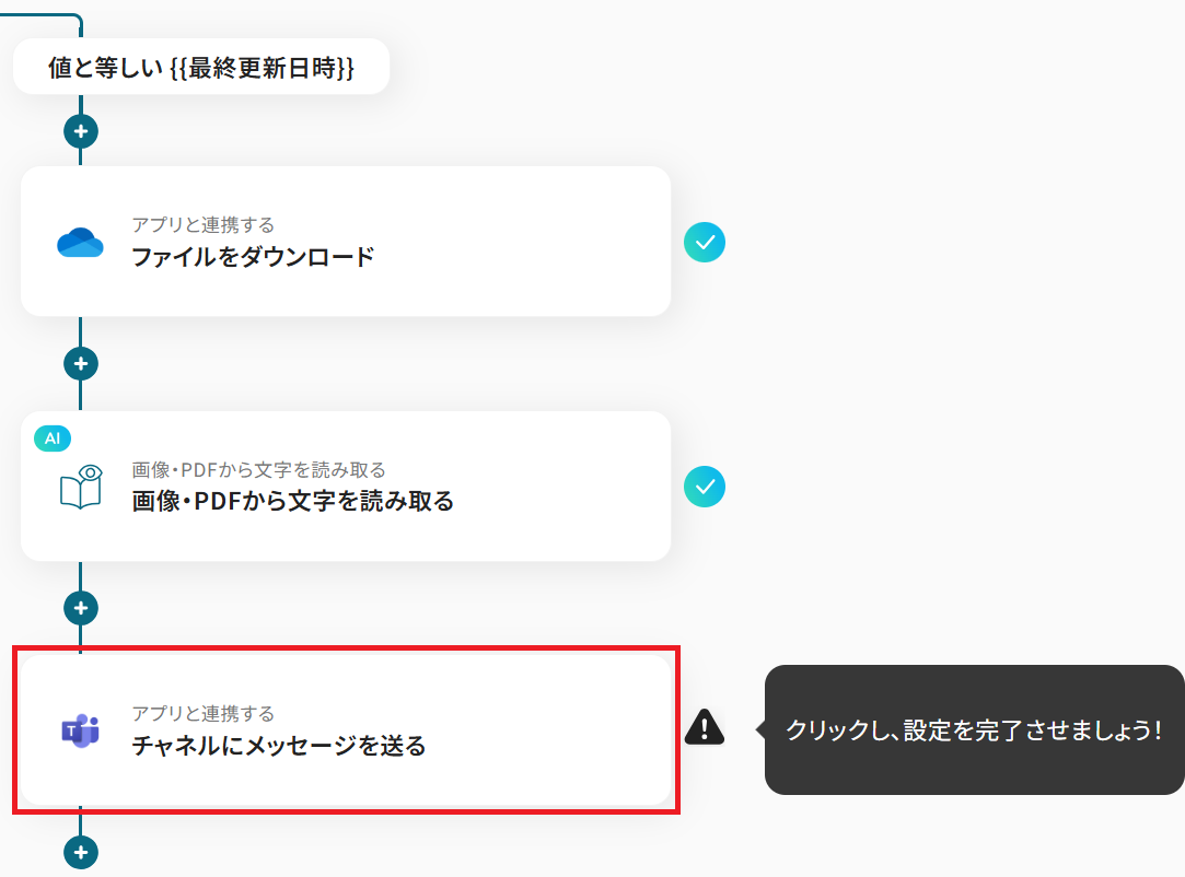 <span class="mark-yellow">OneDriveに特定のファイルがアップロードされた際に、そのファイルからOCR機能を使ってテキスト情報を自動で抽出し、その内容をMicrosoft Teamsの指定したチャンネルや個人に通知する</span>基本的な連携フローです。手作業でのファイル確認や情報伝達の手間を大幅に削減し、迅速かつ正確な情報共有を実現できます!