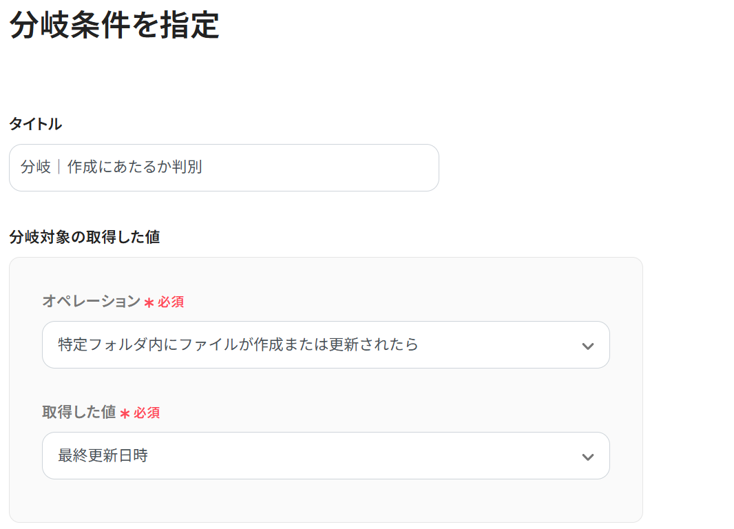 まず「分岐対象の取得した値」を設定します。オペレーションは「特定フォルダ内にファイルが作成または更新されたら」のままでOKです。 取得した値の欄には、プルダウンから「最終更新日時」を選択しましょう。