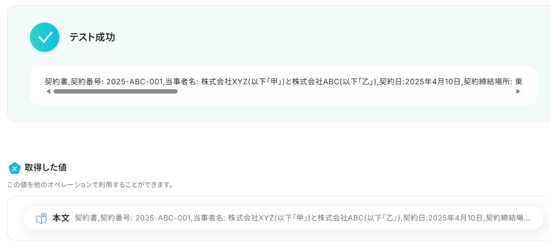 5.入力を終えたら「テスト」をクリックし、「取得した値」にデータが抽出されていることを確認してください。 確認したら「保存する」をクリックしましょう。 取得した値は、後続の設定で活用できます!
