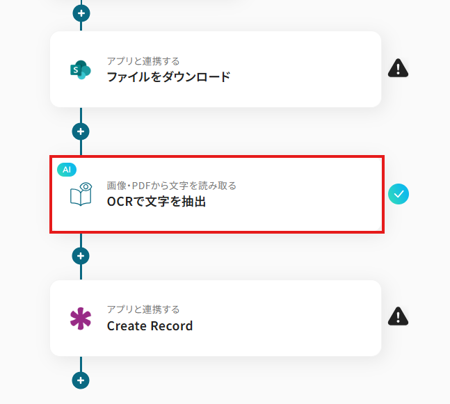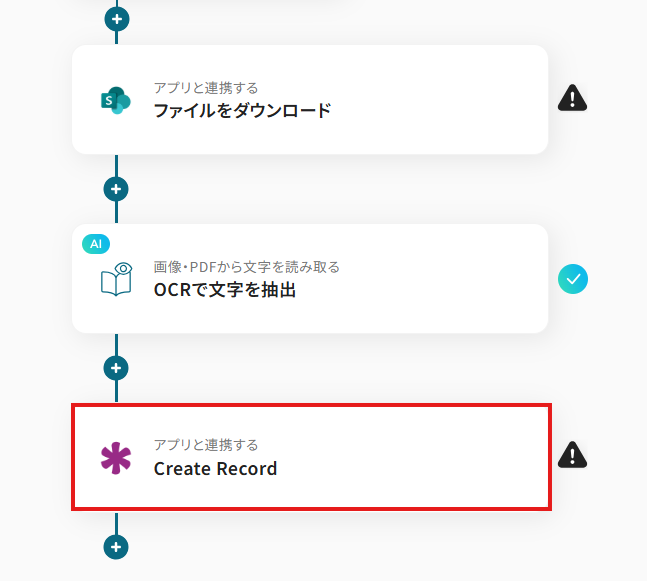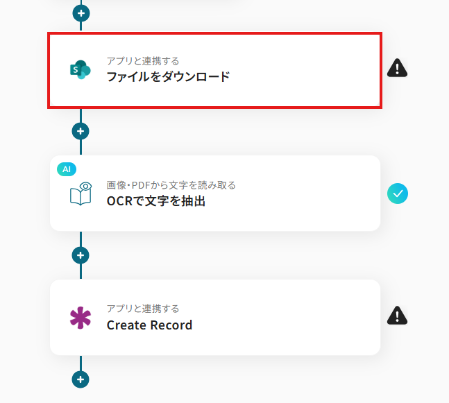 はじめに、Microsoft SharePointとKnackをYoomと連携する 次に、トリガーでMicrosoft SharePointを選択し、「サイト内の指定フォルダにファイルが作成または更新されたら」というアクションを設定する 続けて、オペレーションで分岐機能を追加し、ファイルが「作成」された場合のみ後続のアクションに進むよう設定する さらに、オペレーションでMicrosoft SharePointの「ファイルをダウンロード」アクションを設定する 次に、OCR機能の「任意の画像やPDFを読み取る」アクションで、ダウンロードしたファイルからテキストを抽出する 最後に、オペレーションでKnackの「Create Record」アクションを設定し、抽出したデータを基にレコードを作成する ※「トリガー」:フロー起動のきっかけとなるアクション、「オペレーション」:トリガー起動後、フロー内で処理を行うアクション