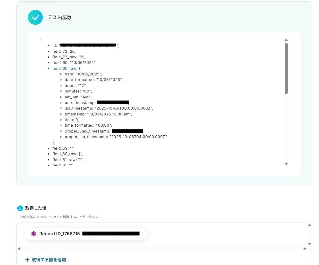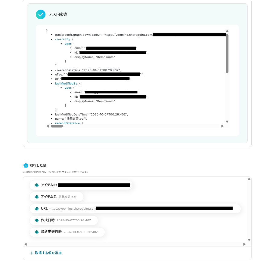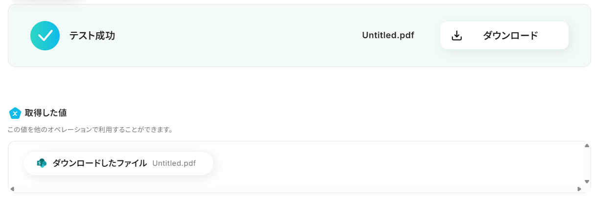 ※取得した値とは? トリガーやオペレーション設定時に、「テスト」を実行して取得した値です。 取得した値は、後続のオペレーション設定時の値としてご利用いただくことができ、フローボットを起動する度に、変動した値となります。 ※詳しくは、こちら をご参照ください。