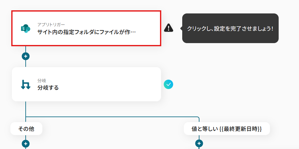 1.まずは、アプリトリガー設定です。 先ほどの画面で「OK」をクリックして、表示された画面のアプリトリガー「サイト内の指定フォルダにファイルが作成または更新されたら 」をクリックしましょう。