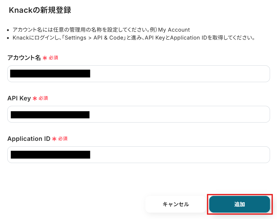 1.続いてKnackをマイアプリ登録します。 先ほどと同様に、連携可能なアプリ一覧からKnackを検索します。 次の画面で、必須項目を入力し、「追加」をクリックしましょう。