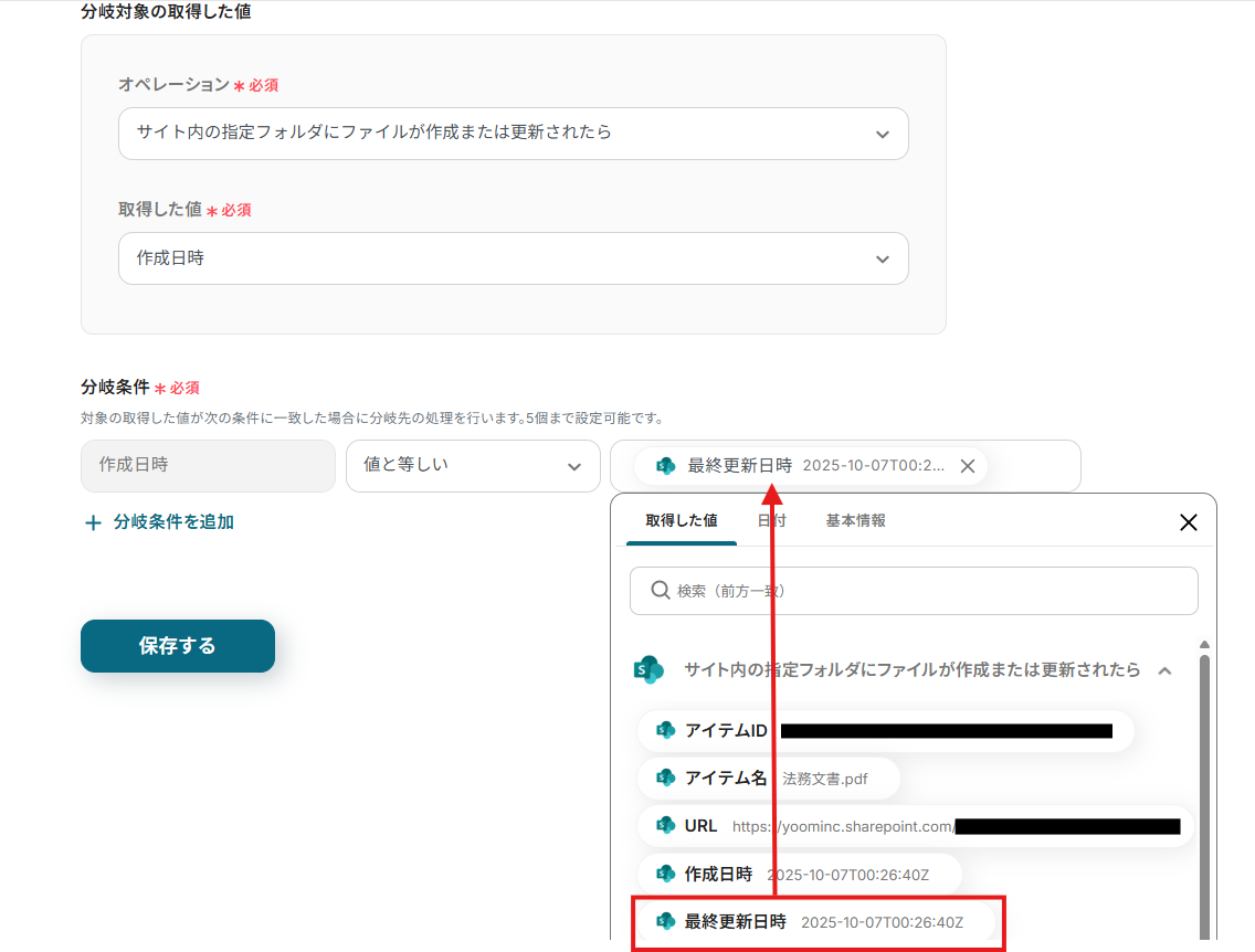オペレーションに「サイト内の指定フォルダにファイルが作成または更新されたら」、取得した値に検知したい項目を設定します。