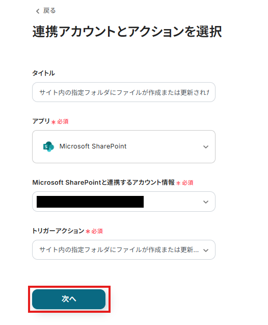 2.連携アカウントとアカウント選択画面が表示されるので、設定内容を確認しましょう。 連携するアカウント情報には、ステップ1で連携したアカウント情報が反映されています。トリガーアクションはそのままにして、「次へ」をクリックしてください。