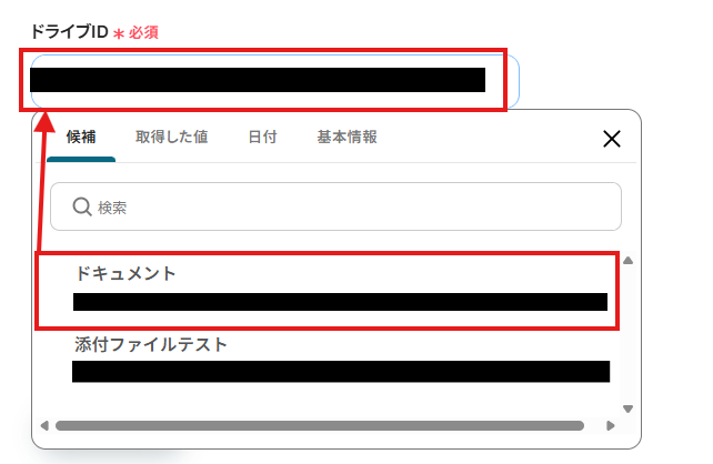 「アイテムID」は、入力欄をクリックして表示される取得した値から選択してください。 取得した値を活用することで、固定値ではなく、トリガーが実行されるたびに最新の情報が反映できます。