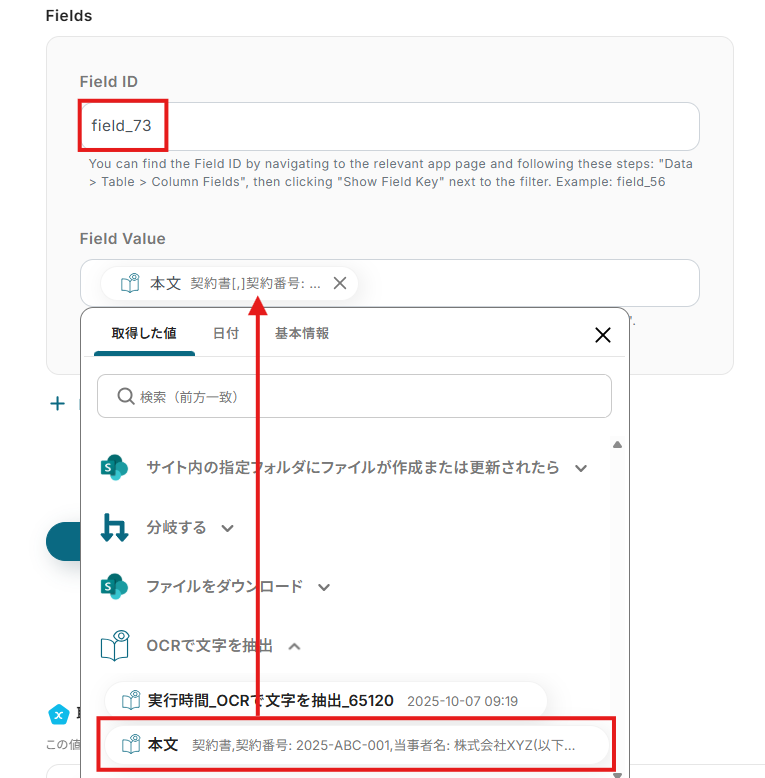 3.Fieldsの各項目を設定していきましょう。 「Field ID」は、入力欄下の注釈に沿って、入力しましょう。 「Field Value」は、入力欄をクリックして表示される取得した値から選択してください。 「+Fieldsを追加」 をクリックすると、新しい項目を追加することが可能です。