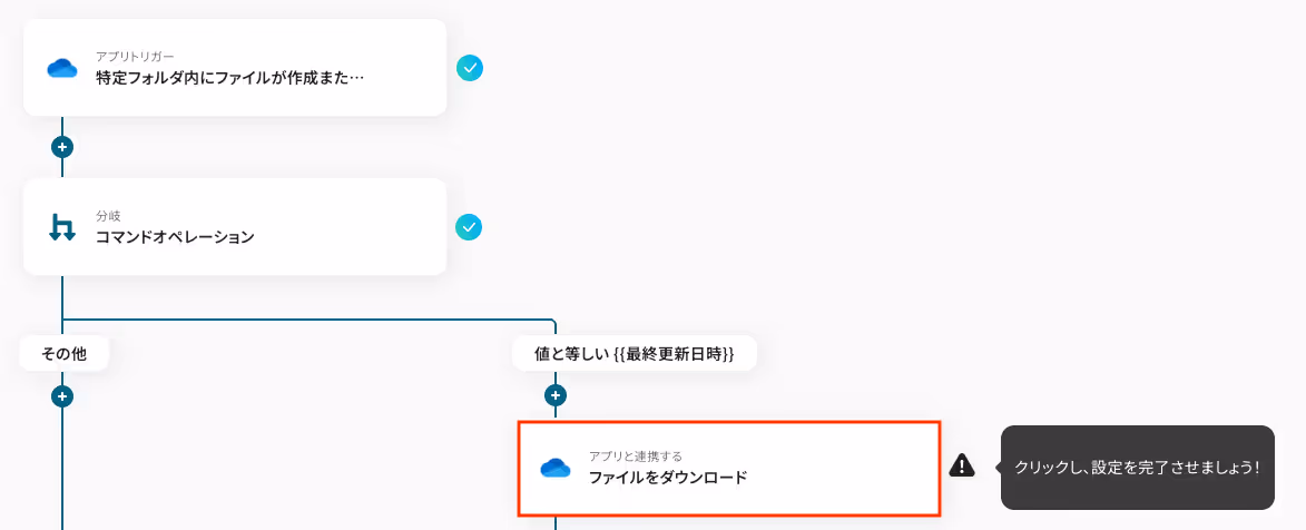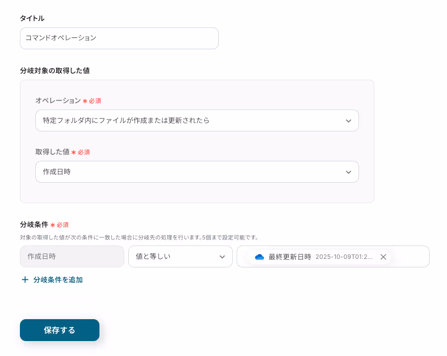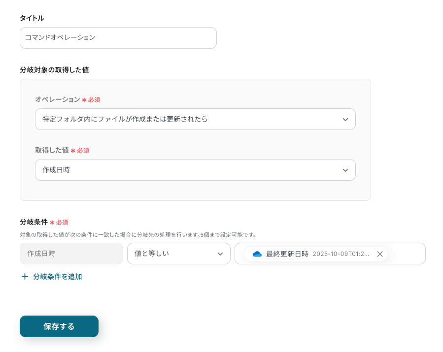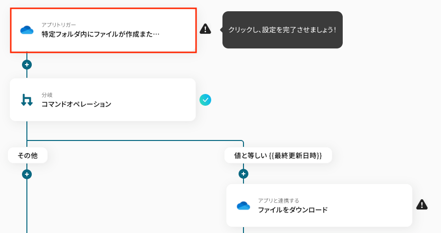一つ目のオペレーションにある、「特定フォルダ内にファイルが作成または更新されたら」をクリックしてください。