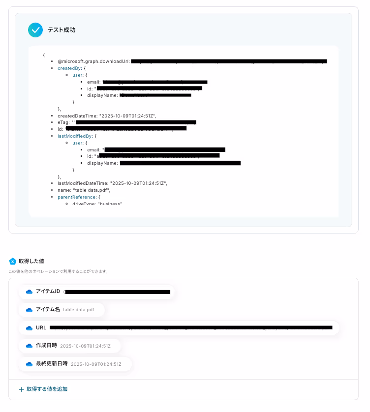 「ドライブID」を候補から選択し、「ファイルのアイテムID」は取得した値から選択します。