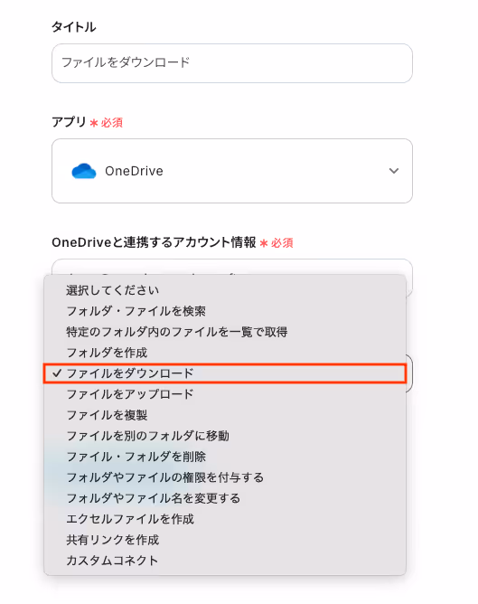 作成されたファイルの内容をOCRで読み取るにあたって、OneDriveからファイルをダウンロードするための設定をします。
