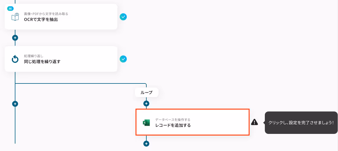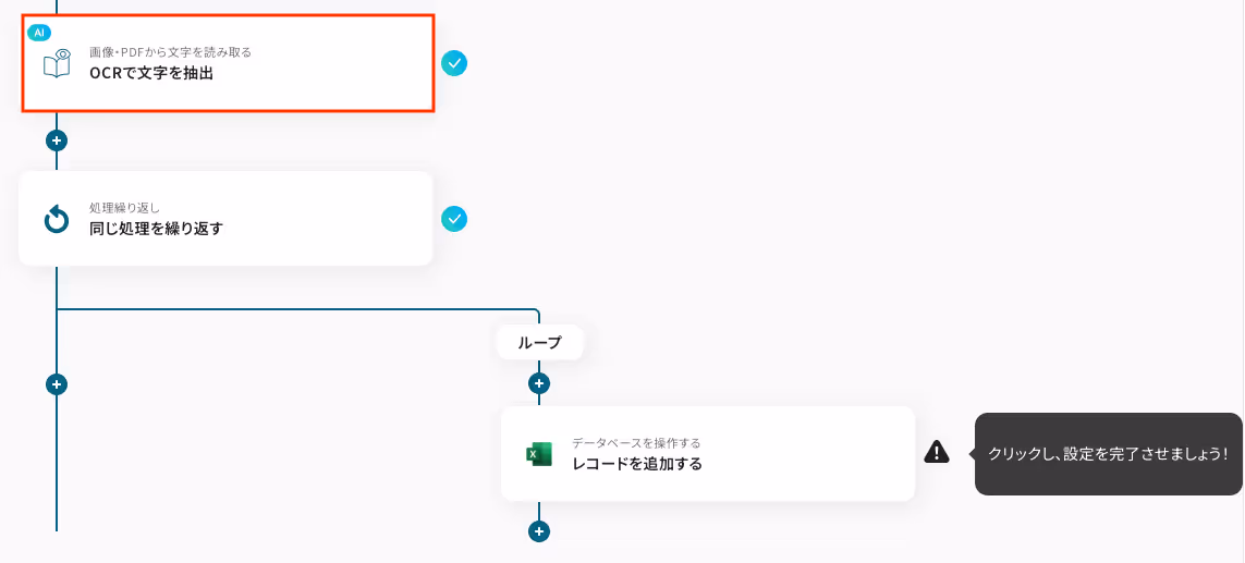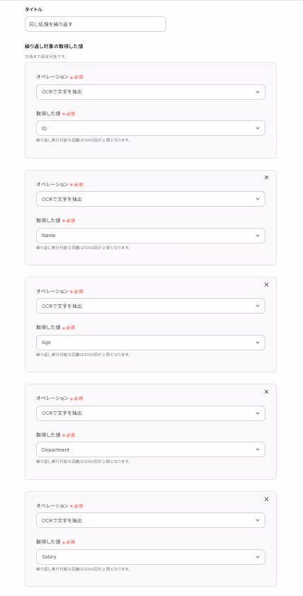 OCRで抽出したい項目に指定した値をMicrosoft Excelに追加するにあたり、ループ処理を行うための設定をします。