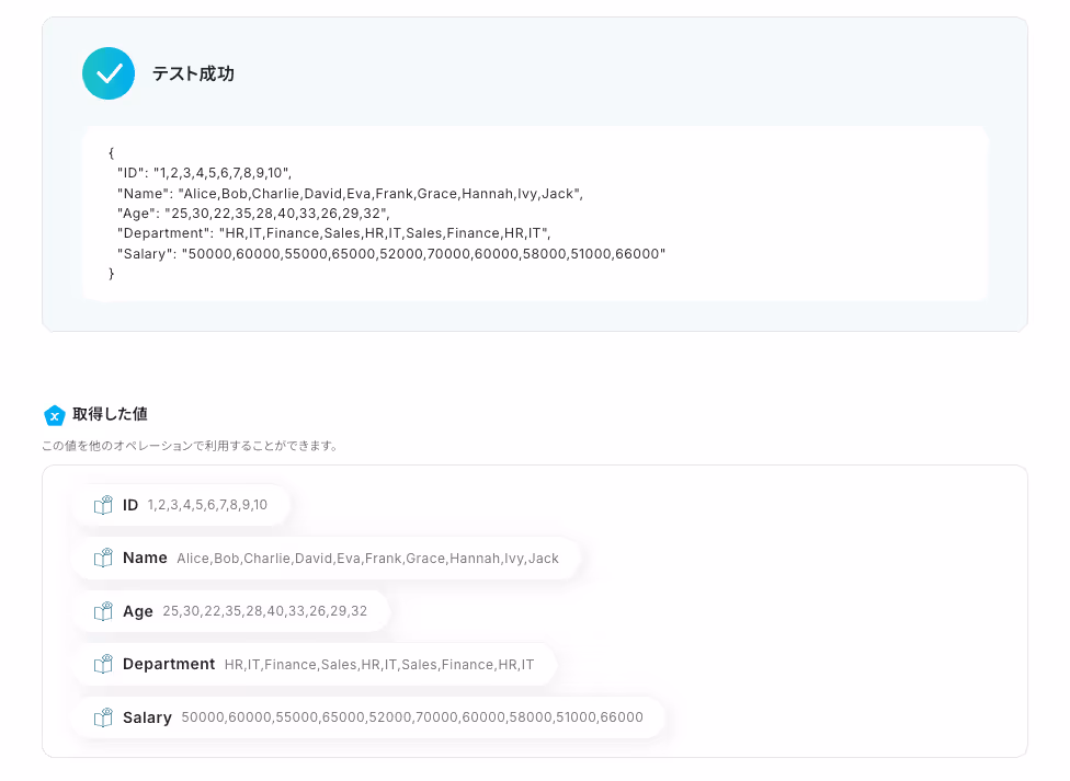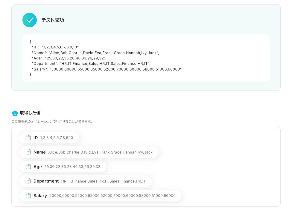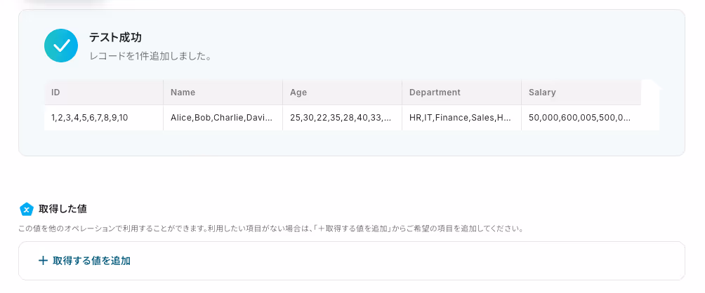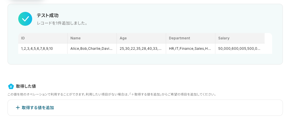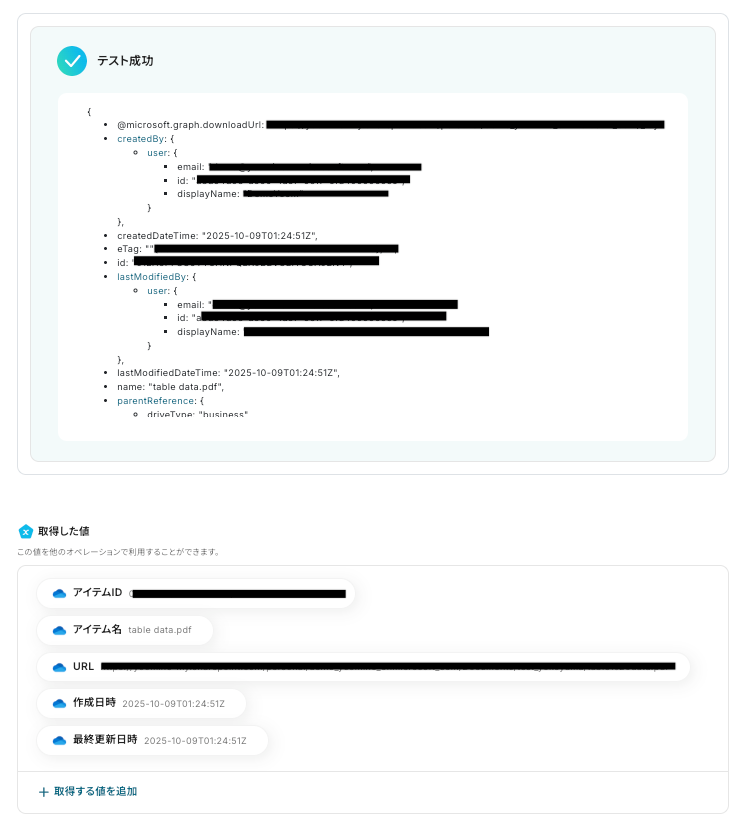 テストが成功すると、以下のように「取得した値」が表示されます。