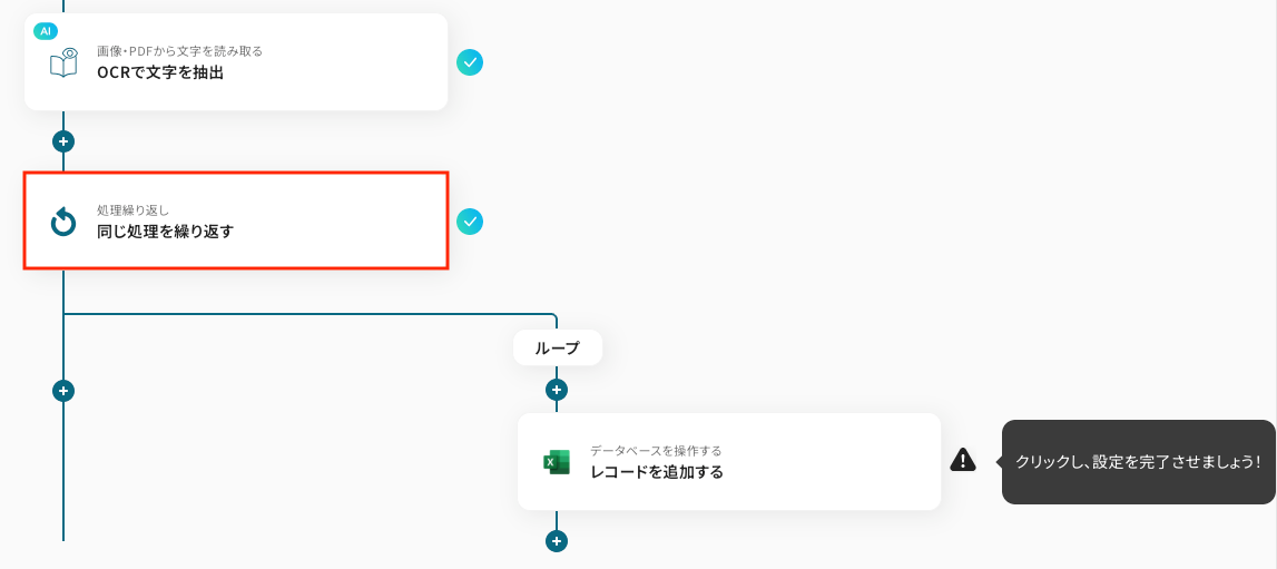 ・「同じ処理を繰り返す」オペレーション間の操作は、チームプラン・サクセスプランでのみご利用いただける機能となっております。フリープラン・ミニプランの場合は設定しているフローボットのオペレーションやデータコネクトはエラーとなりますので、ご注意ください。