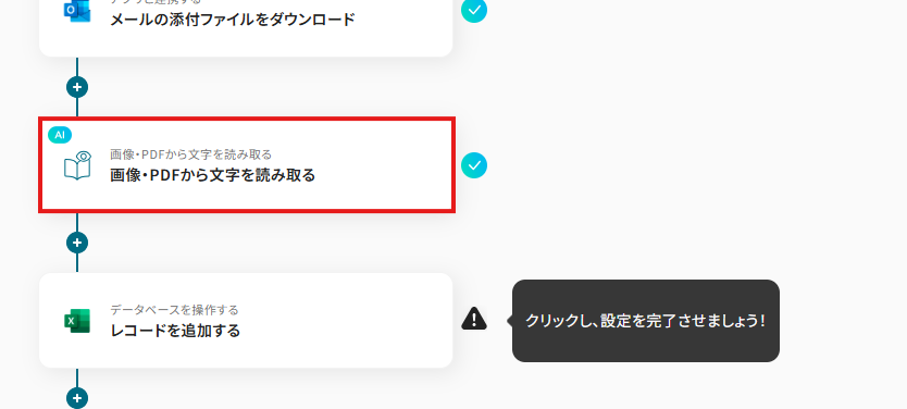 それではここから代表的な例として、Outlookで受信したメールの添付ファイルをOCRで読み取り、その内容をMicrosoft Excelに自動で追加するフロー を解説していきます!