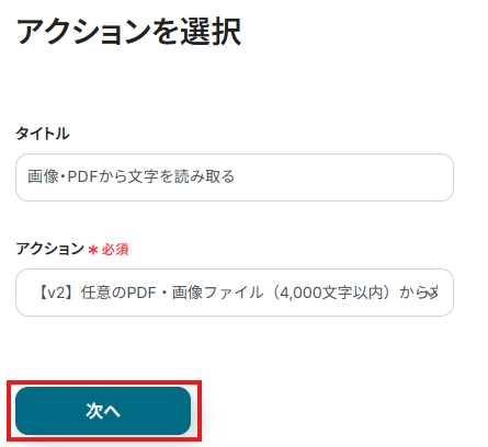 タイトルは、そのままで問題ありませんが、必要であれば変更してください。 アカウント情報を確認します。 今回は、アクションを「【v2】任意のPDF・画像ファイル(4,000文字以内)から文字情報を読み取る(5タスク)」に設定していきます。
