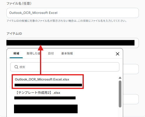 アイテム名:ファイル名を入力すると候補にファイルが表示されるのでクリックします