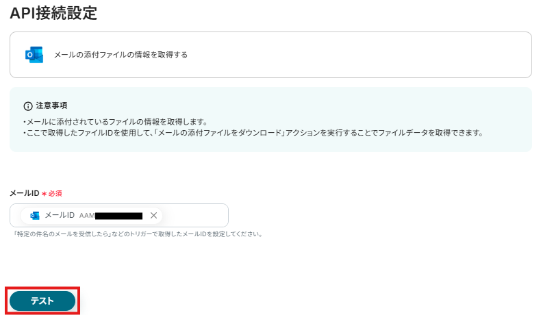 以下の画像のように、「ファイルの添付方法」は変更せず、「抽出したい項目」に任意の内容を設定して「テスト」をクリックします。