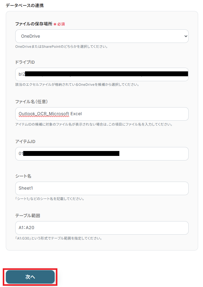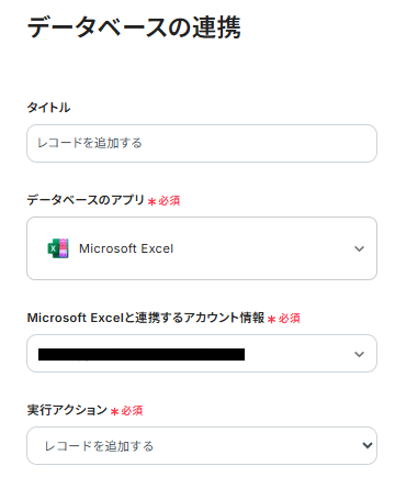 最後に、Microsoft Excelにレコードを追加する設定をしていきます。 Microsoft Excelのデータベースを操作するオペレーションの設定に関しては下記をご参照ください。