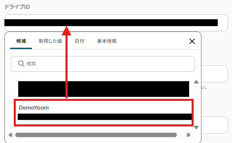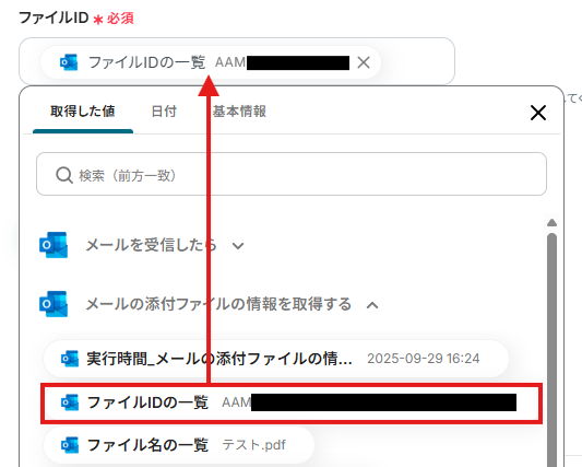 ファイルID:「メールの添付ファイルの情報を取得する」のプルダウンを開いて「ファイルIDの一覧」を選択します