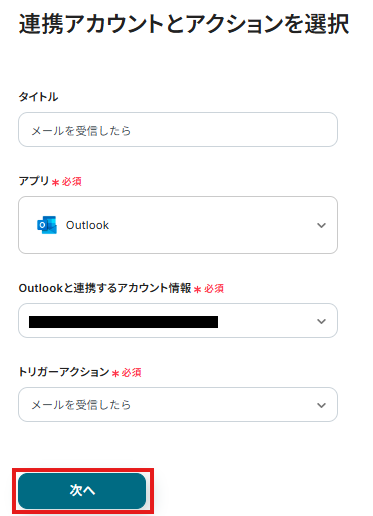 タイトルは、そのままで問題ありませんが、必要であれば変更してください。 アカウント情報を確認します。 トリガーアクションが「メールを受信したら」になっていることを確認して「次へ」をクリックします。