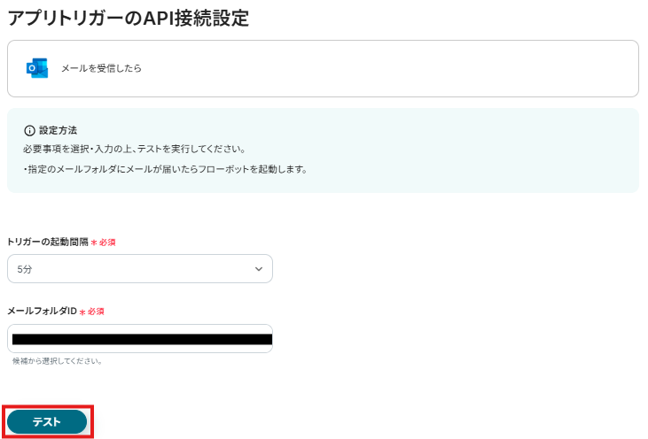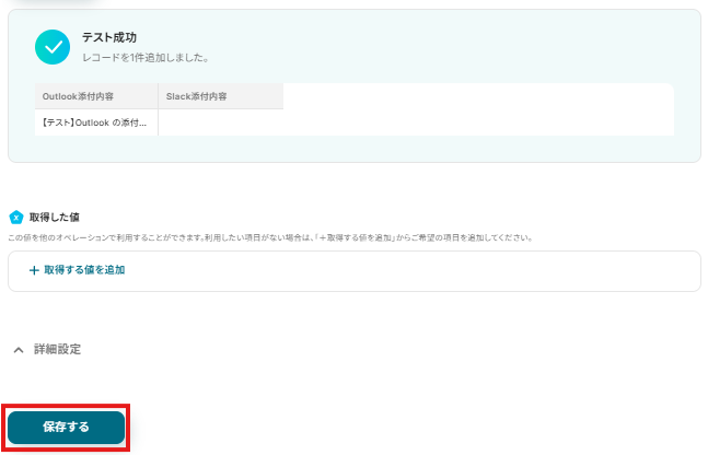 テストが成功すると、Outlookで受信した情報が取得されるので、確認したら保存してください。