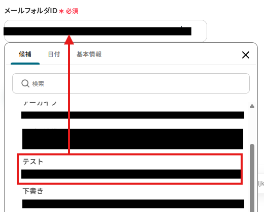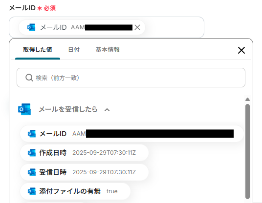 メールID:取得した値タブから「メールを受信したら」のプルダウンを開いて、メールIDを選択します