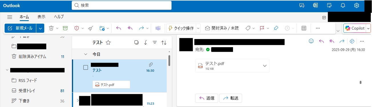 3.Outlookにテストのためにファイルを添付したメールを送信
